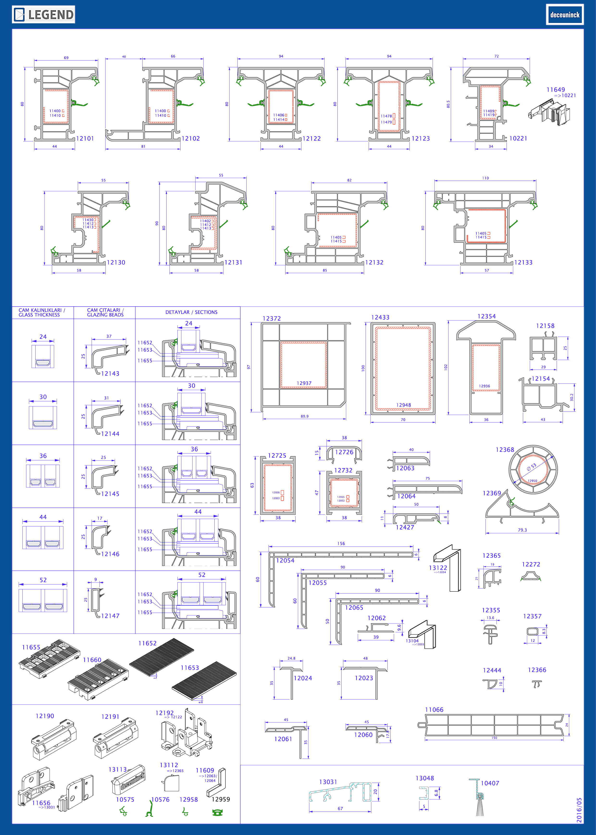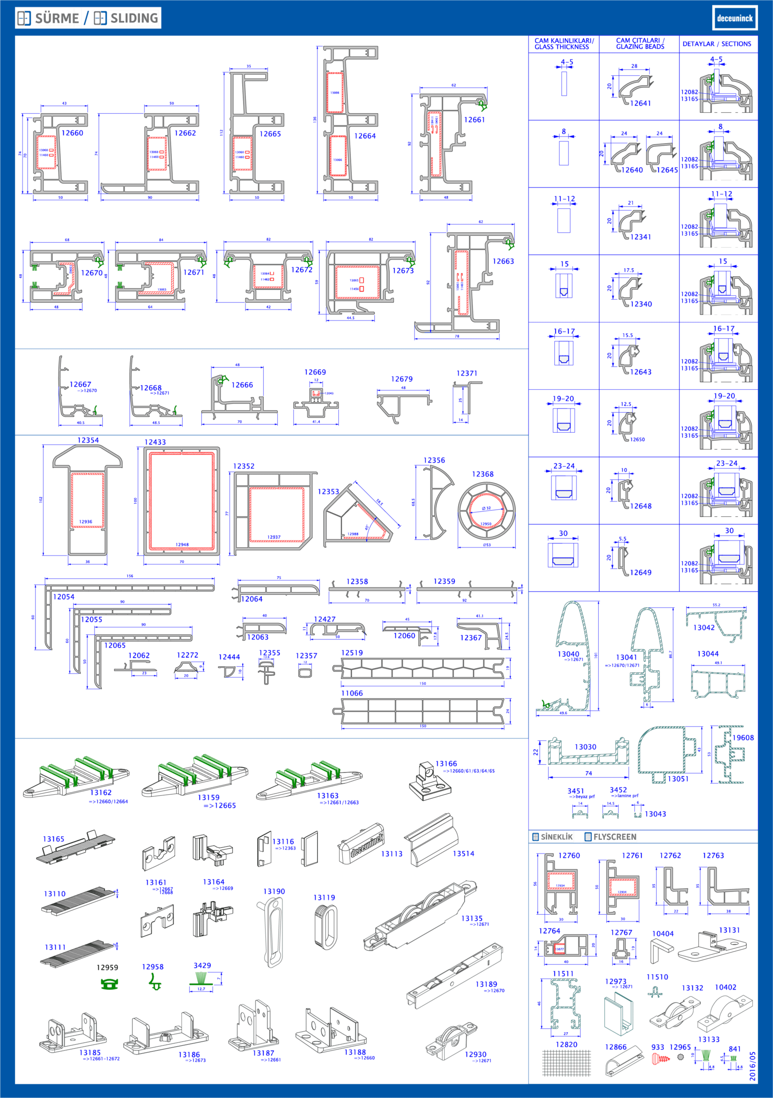 Açılım Seçenekleri : Sürme tek ray, çift ray, üç ray kasa profilleri ve sineklikli kasa, pervazlı kasa uygulamalarıUf : 2.0 W / m².K